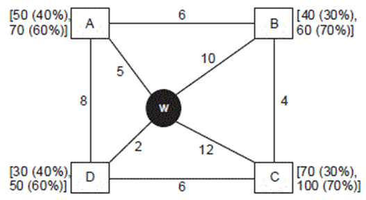 Question Numbers (1 to 5): Every day a widget supplier supplies widgets from the warehouse (W) to four locations – Ahmednagar (A), Bikrampore (B), Chitrachak (C), and Deccan Park (D). The daily demand for widgets in each location is uncertain and independent of each other. Demands and corresponding probability values (in parenthesis) are given against each location (A, B, C, and D) in the figure below. For example, there is a 40% chance that the demand in Ahmednagar will be 50 units and a 60% chance that the demand will be 70 units. The lines in the figure connecting the locations and warehouse represent two-way roads connecting those places with the distances (in km) shown beside the line. The distances in both the directions along a road are equal. For example, the road from Ahmednagar to Bikrampore and the road from Bikrampore to Ahmednagar are both 6 km long.