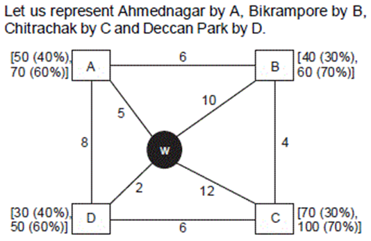 - Given that the last location is Ahmednagar, which means that the demand at A was the least among the four locations. So the demand at A is 50. Then demand at B will be 60 and demand at D will be 50 (because these values cannot be less than the demand at A). Demand at C can be either 70 or 100, whichever be the case he will go from the warehouse to C first, thereby c traveling 12 km. From C he will go the the location with the next highest demand, which is B, thereby covering 4 km. Then he will go to D and cover (10 + 2 =) 12 km. Finally he will go to A, taking the path with the least distance, thereby covering (2 + 5 =) 7 km. Total distance covered = 12 + 4 + 12 + 7 = 35 km.