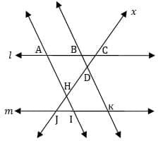 In the given figure, lines l and m are parallel to each other. Transversals AI and BK are also parallel to each other. If m ∠HJI = 50° and m ∠JHI = 45 then find m ∠CBD.