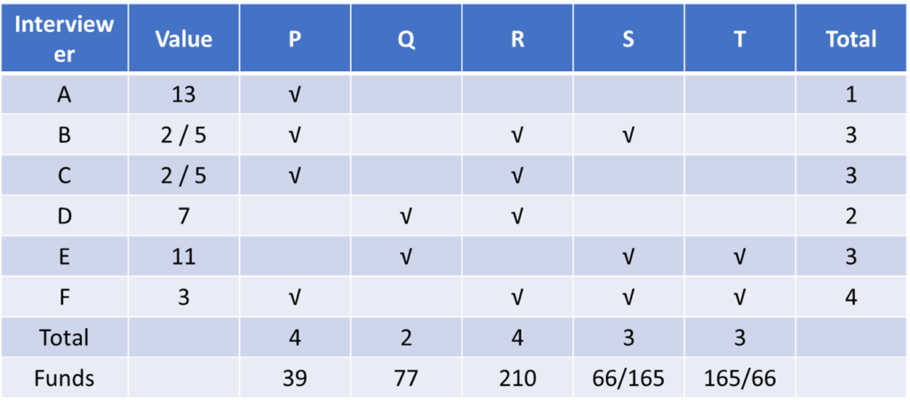 Adhara, Bithi, Chhaya, Dhanavi, Esther, and Fathima are the interviewers in a process that awards funding for new initiatives. Every interviewer individually interviews each of the candidates individually and awards a token only if she recommends funding. A token has a face value of 2, 3, 5, 7, 11, or 13. Each interviewer awards tokens of a single face value only. Once all six interviews are over for a candidate, the candidate receives a funding that is Rs.1000 times the product of the face values of all the tokens. For example, if a candidate has tokens with face values 2, 5, and 7, then they get a funding of Rs.1000 × (2 × 5 × 7) = Rs.70,000. Pragnyaa, Qahira, Rasheeda, Smera, and Tantra were five candidates who received funding. The funds they received, in descending order, were Rs.390,000, Rs.210,000, Rs.165,000, Rs.77,000, and Rs.66,000.